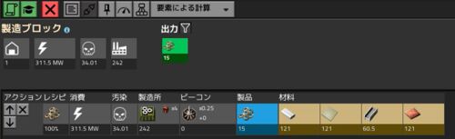 今回は軽量化素材工場の検討だ。 軽量化素材工場の検討 うーむ。またたくさん必要なのか。まいったなあ。 基本構造はこんな感じかな。 軽量化素材生産ラインの基本構成 どんどん設置 不要設備撤去の続き。旧大型モーター生産ラインを撤去する。 旧大型モータ…