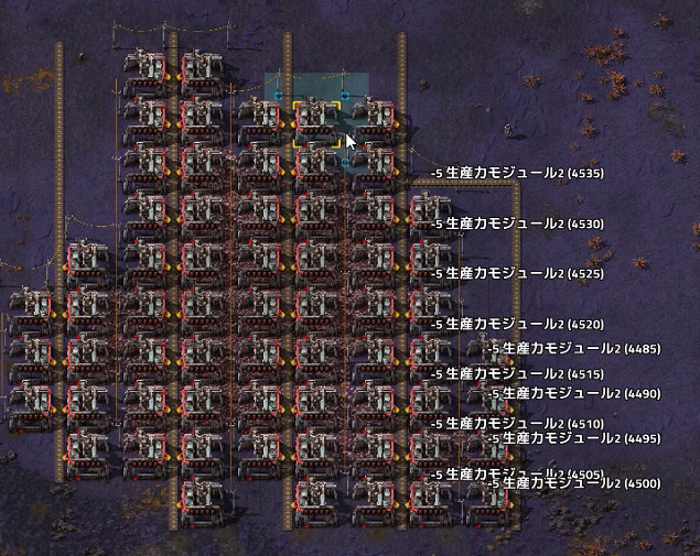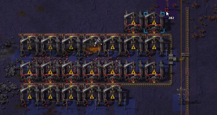 そして実際に工場を稼働させてみる。うーん、鉱石を粉砕する段階が遅いな。ビーコンを設置。